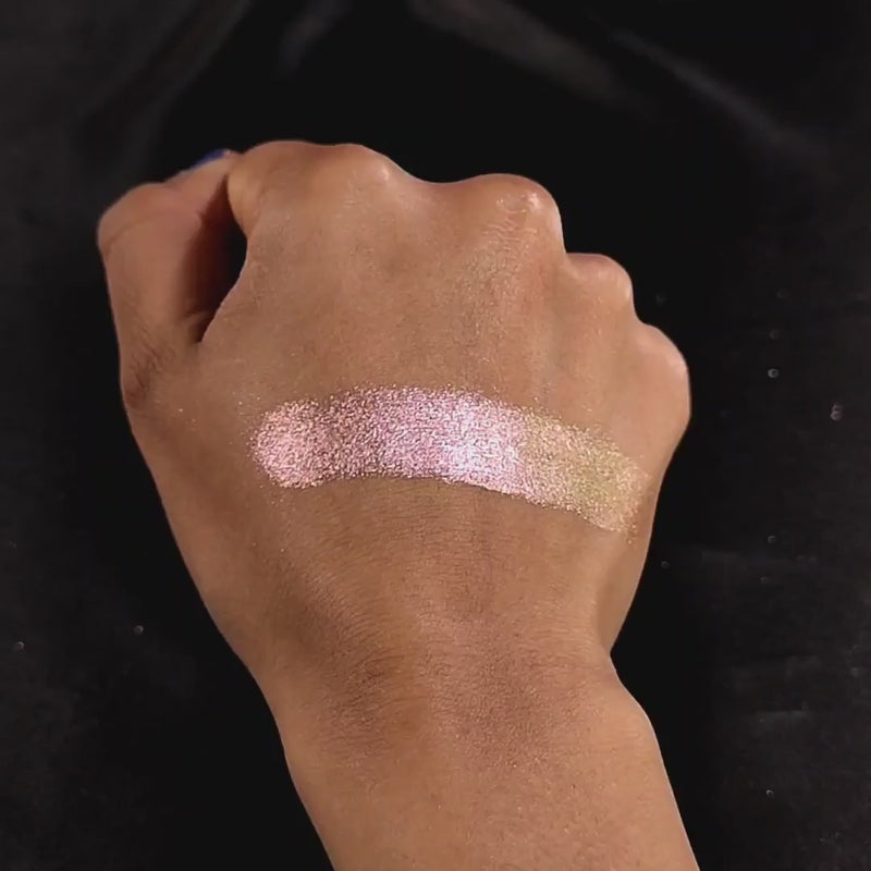 Trichrome with a sparkly metallic finish, that shifts champagne, pink, green-gold.
