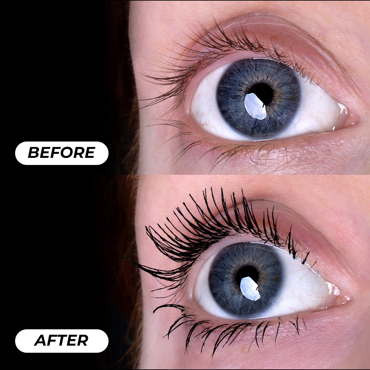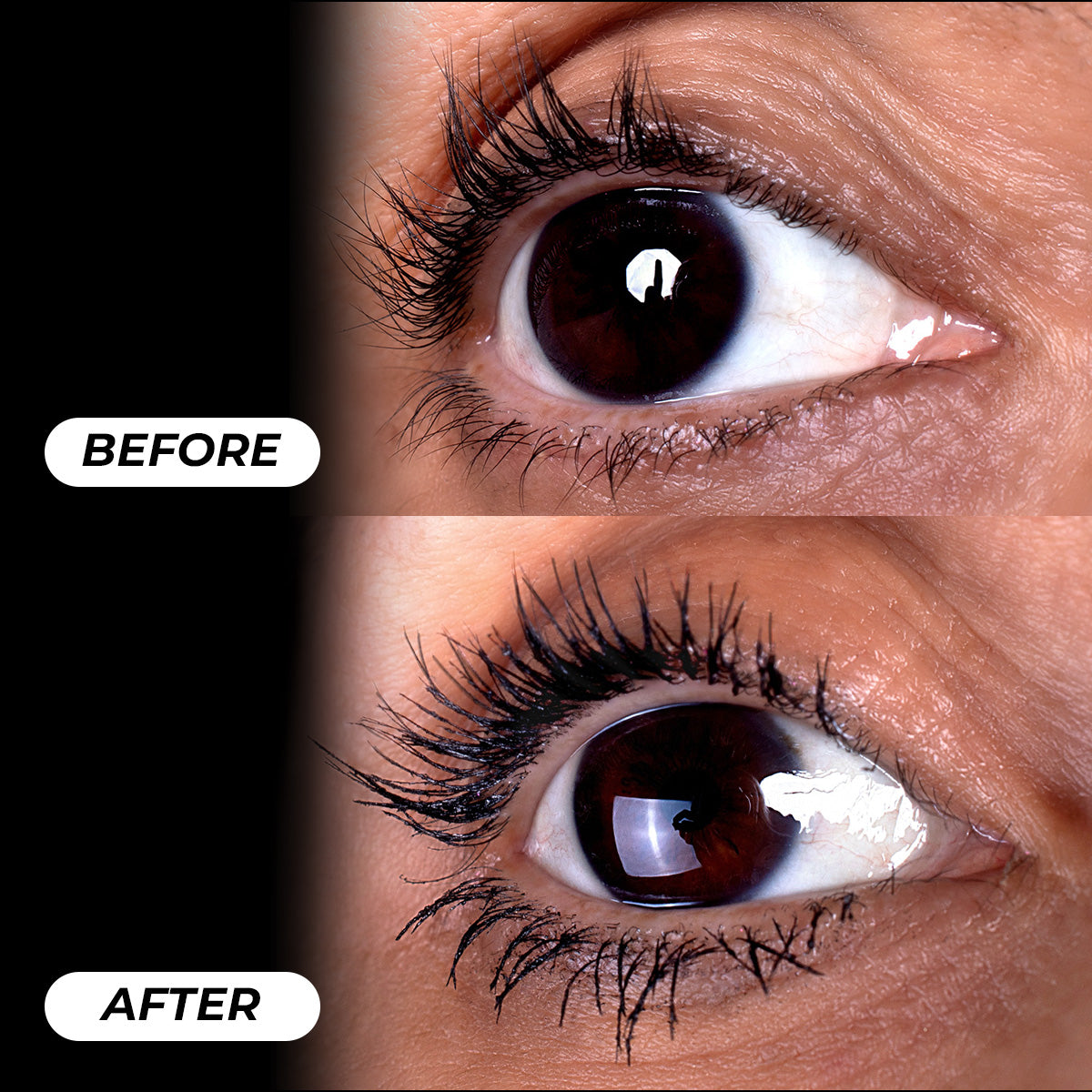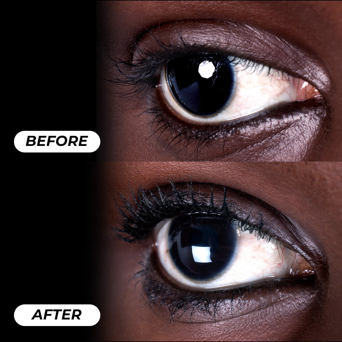 Hold the brush at the base of your lashes and sweep up and through to the tips. For great separation and length, avoid wiggling. Use the narrower end of the brush for your lower lashes.