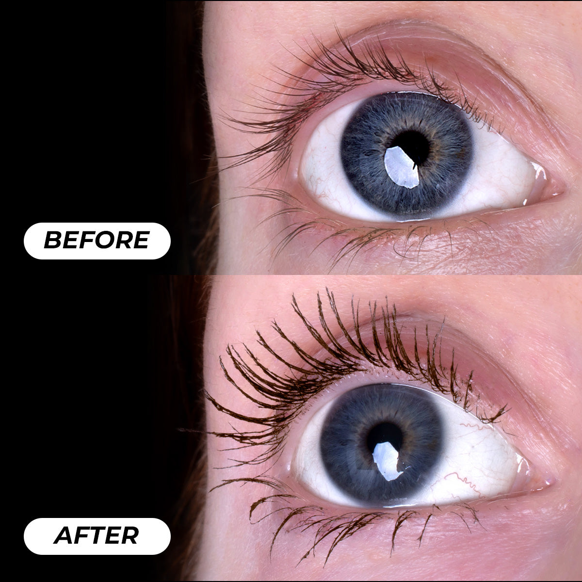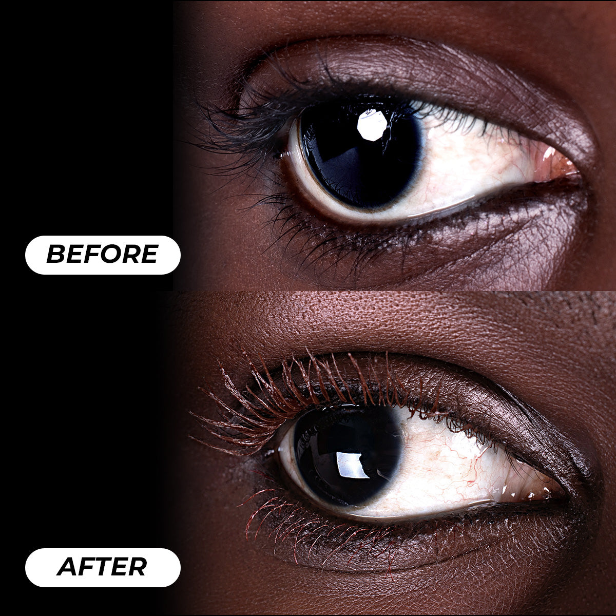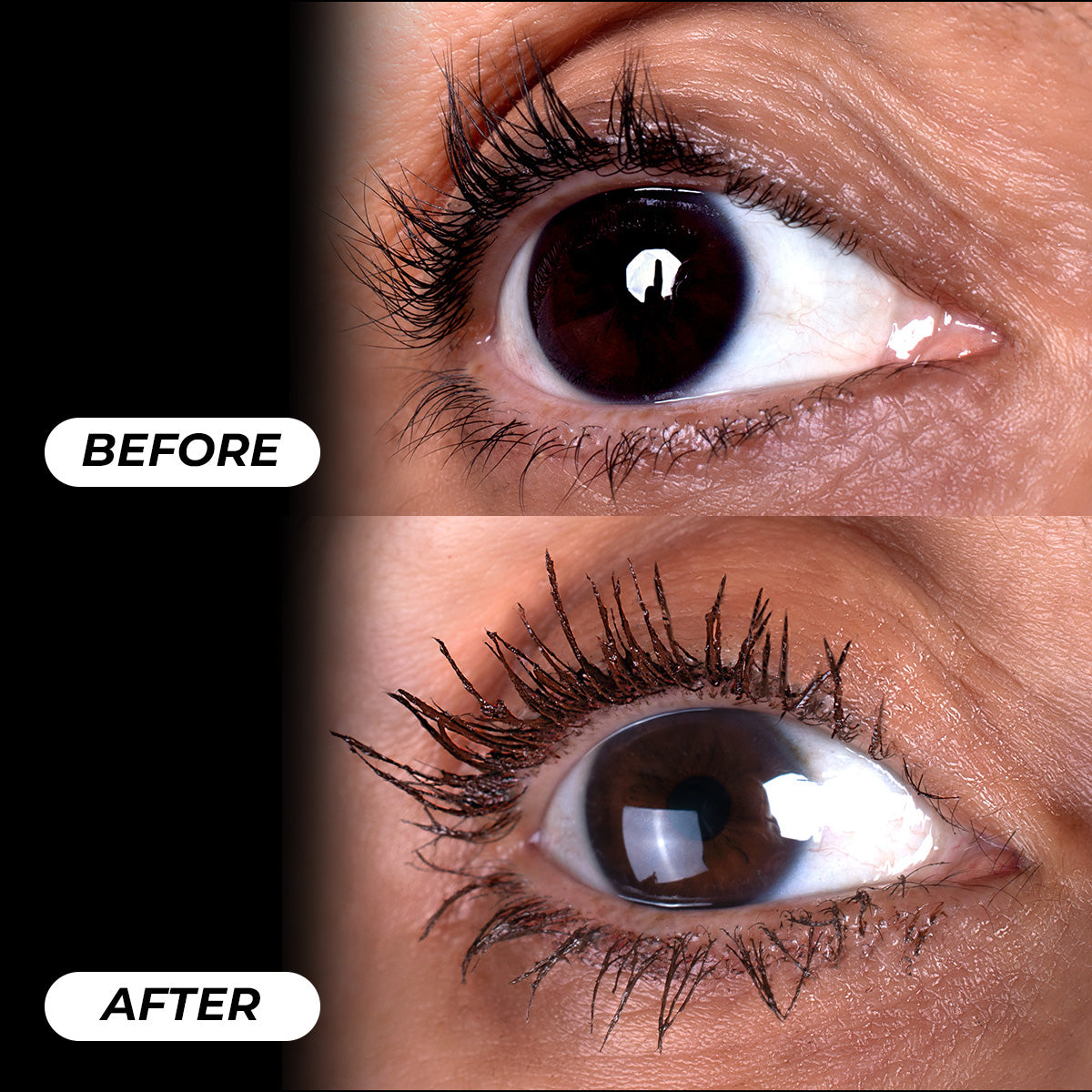 Hold the brush at the base of your lashes and sweep up and through to the tips. For great separation and length, avoid wiggling. Use the narrower end of the brush for your lower lashes.