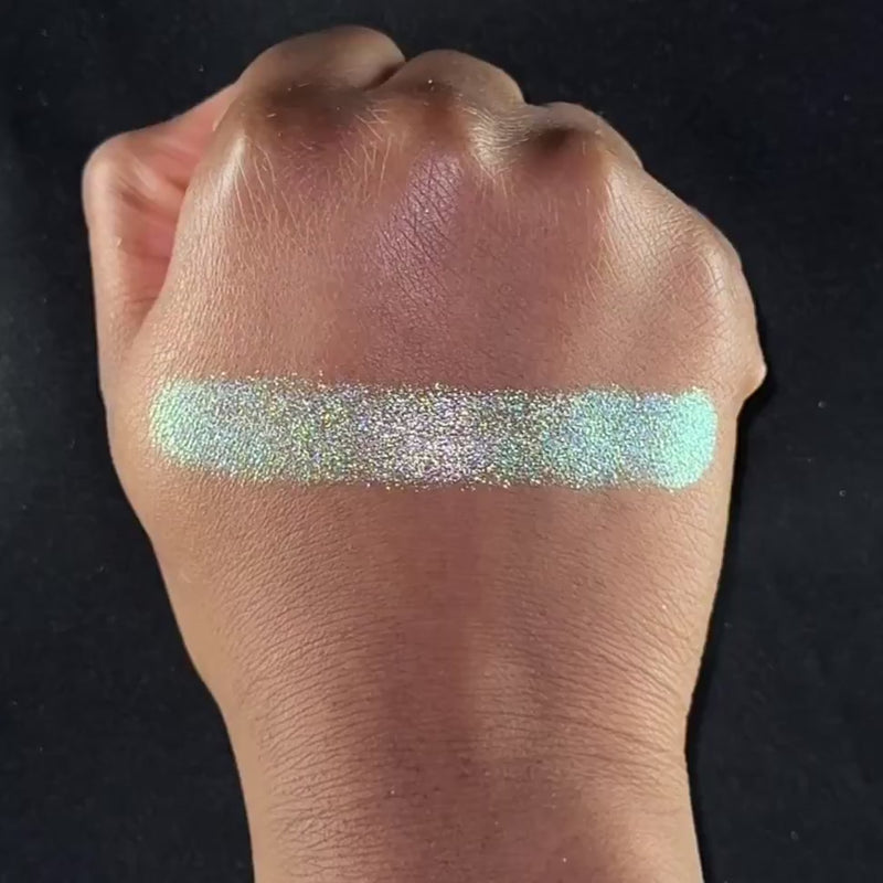 Multichrome with holo effect that shifts green, silver, pink.