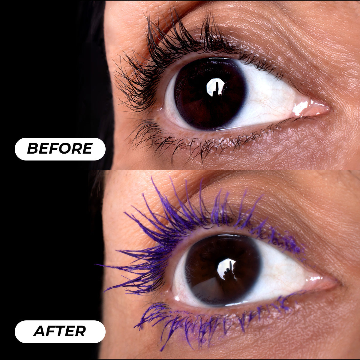 Hold the brush at the base of your lashes and sweep up and through to the tips. For great separation and length, avoid wiggling. Use the narrower end of the brush for your lower lashes.