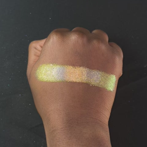 Trichrome with a metallic finish that shifts lilac, green, gold.